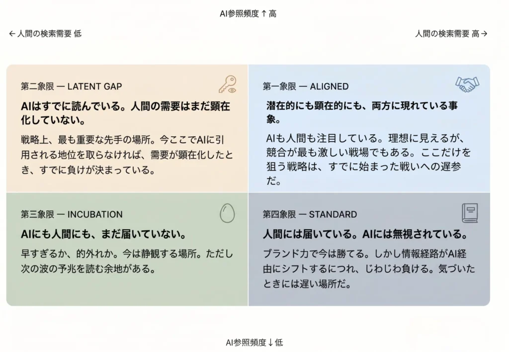 ただ一つだけ先に言っておく。計測できるようになると、自分のサイトがどの象限にいるかが見える。その瞬間、問いが変わる。「どうすれば需要を取れるか」ではなく、「AIはこのコンテンツに何を求めているか」という問いに。